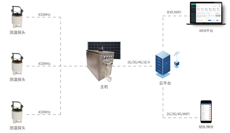 當測溫傳感器實時采集到監(jiān)測點的溫度數(shù)據(jù)時,這些數(shù)據(jù)會迅速上傳至主機,并通過物聯(lián)網(wǎng)卡傳輸至云平臺。用戶只需通過Web平臺或微信公眾號,就能隨時隨地查看線路溫度情況。一旦溫度異常,系統(tǒng)不僅會立即在平臺上顯示告警信息,還會通過短信將告警內(nèi)容發(fā)送到用戶手機,確保問題得到及時處理。